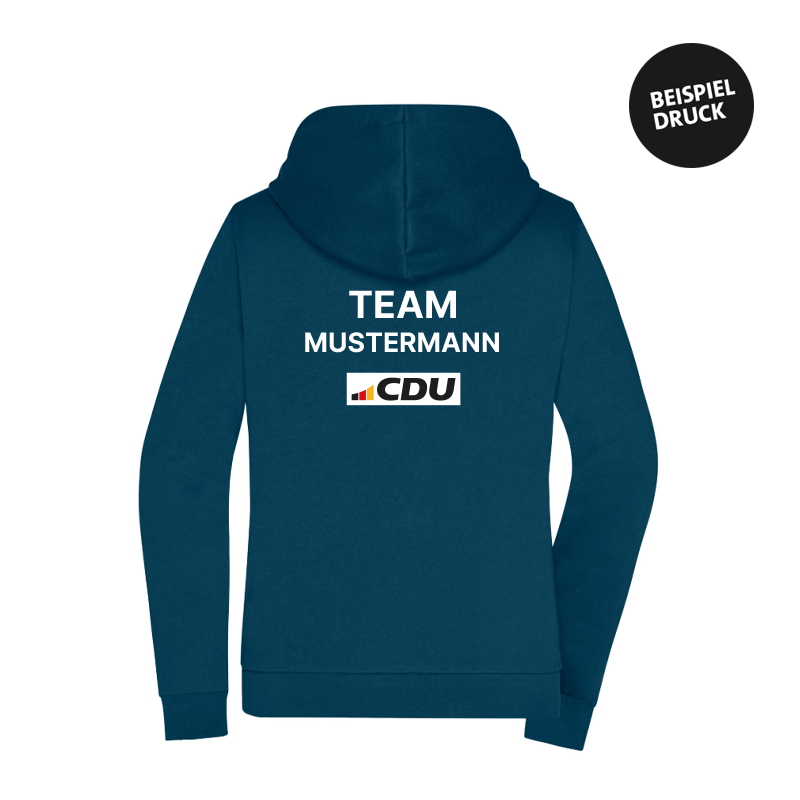 Klassische Sweatjacke mit Kapuze ,Oberstoff (280 g/m²): 80% Baumwolle, 20% Polyester, Sweat-Qualität mit angerauter Innenseite, Doppellagige Kapuze mit Kordelzug, Kängurutasche, Necktape, Bündchen mit Elasthan, Tear off!® - Label, leicht tailliert. Größe: XS, Farbe: pertol (ca Pantone 547), inkl. 1-fbg. Transferdruck klein auf die Brust, inkl. 1-fbg. Transferdruck groß auf den Rücken