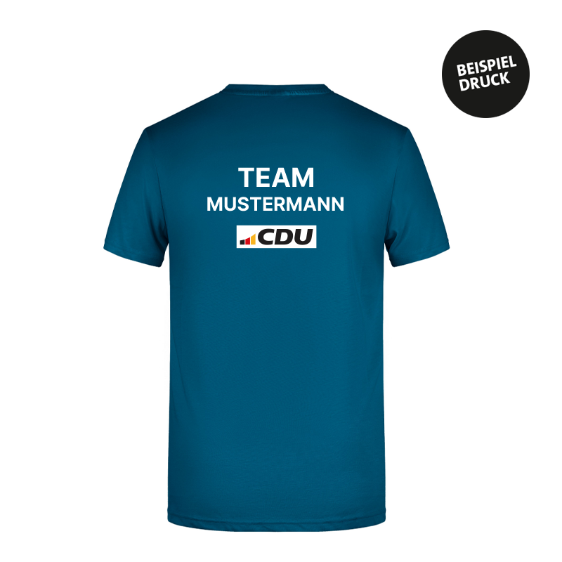 T-Shirt in klassischer Form aus 100 % ringgesponnener Bio Baumwolle, Single Jersey, Oberstoff (140 g/m²): 100% BioBaumwolle, Rundhalsausschnitt, Bündchen mit Elasthan Größe S, Farbe: pertol (ca Pantone 547), inkl. 1-fbg. Transferdruck klein auf eine Brustseite, inkl. 1-fbg. Transferdruck groß auf dem Rücken